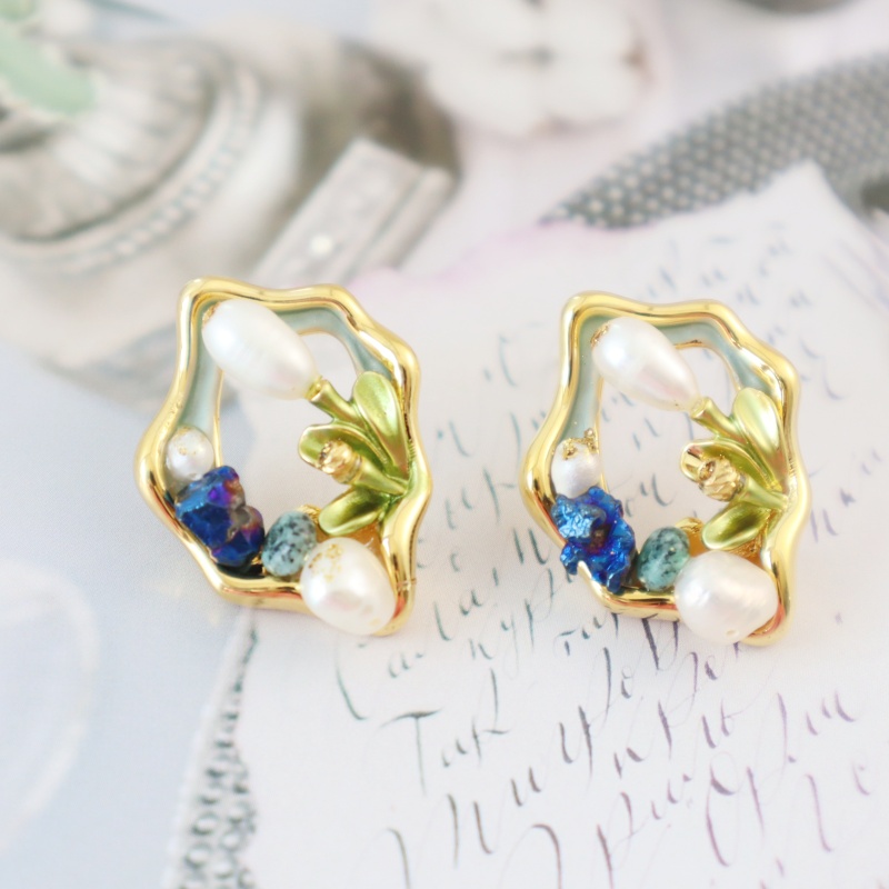 A peek into a secret glade where pearls grow on vines and enchanted stones glisten. These earrings embody the playful yet elegant spirit of a forest nymph.