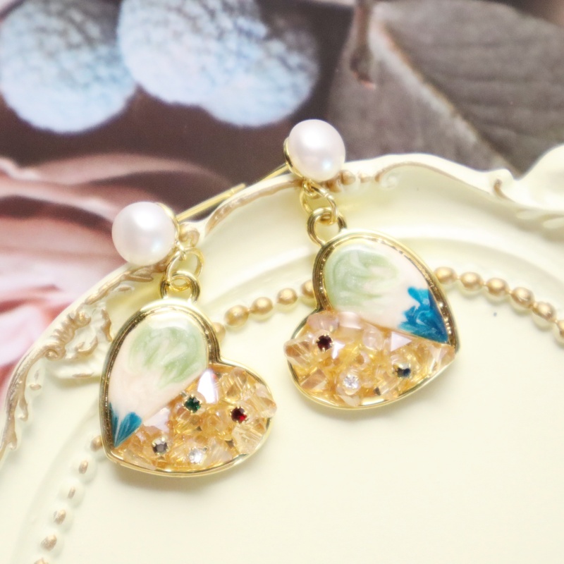Shaped like tiny treasure hearts, this design brings together crystal fragments and painted petals to represent cherished memories—each color a different moment, each sparkle a feeling preserved in time.
