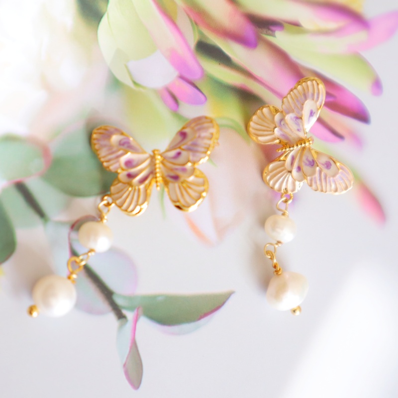 These soft lilac butterflies, edged in gold and kissed with pearls, were inspired by a dream of fluttering through fields of wisteria at sunset. The designer captured that gentle flight and the shimmer of twilight air in this delicate, romantic pair.