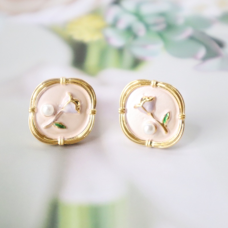 This serene and romantic pair was inspired by a single pressed flower on a love letter. Framed in antique gold, the minimalist lilac bloom and pearl tell a tale of elegance, patience, and quiet affection.