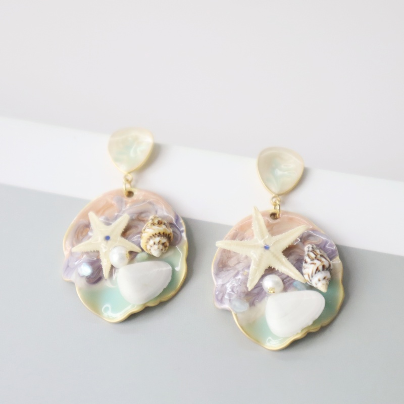 Named after the mythical sirens, these earrings echo songs of the deep. Shells, pearls, and a starfish are swirled into a seascape of pastel waves—whispers of ocean tales worn by dreamers and sea-spirits.