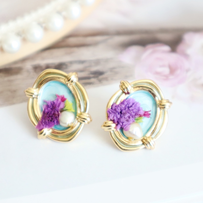 Inspired by the idea of a floating garden suspended between clouds, these earrings capture the delicate charm of a sky-kissed bloom. A preserved violet flower rests gently against a serene blue backdrop, like a blossom drifting in the breeze above the treetops. Encircled in golden curves with a single pearl like a drop of morning dew, they whisper of whimsy, wonder, and a world where gardens bloom in the sky.