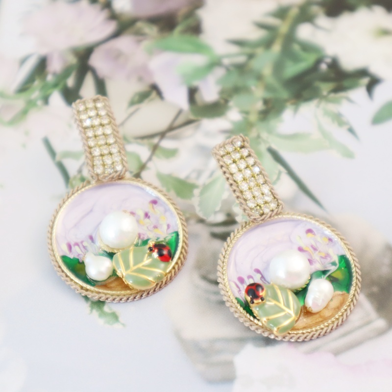Circular earrings with painted floral landscapes, pearls, leaves, and ladybugs.