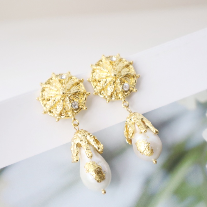 Gold-dusted baroque pearls drip from sculpted golden blooms like sacred artifacts. Inspired by ancient treasures unearthed by time and sun, this design brings myth and radiance to life in a single gleam.