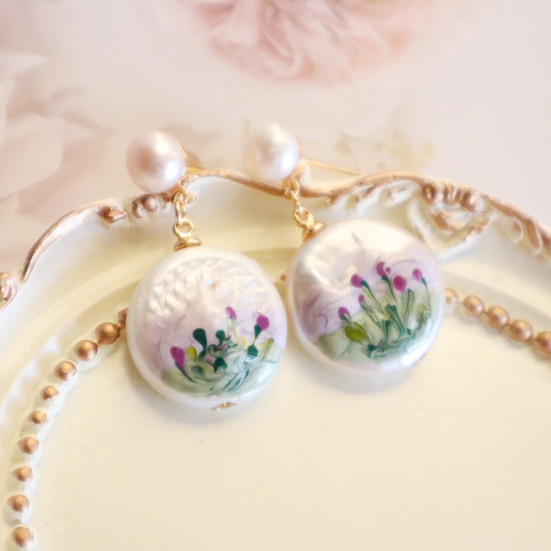 Painted within lustrous pearl-like discs, tiny florals bloom as if whispered into existence by a passing spring breeze. Inspired by pressed flowers tucked in old journals, these earrings carry the quiet secrets of a moonlit garden.
